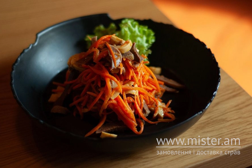 Смачний салат з вареного язика, моркви по-корейськи та печериць. Яскраве поєднання інгредієнтів з легким гострим акцентом моркви та ніжністю язика.