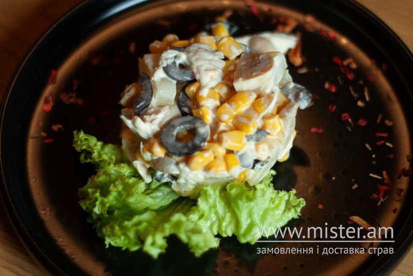 Смачний салат з печерицями, ананасом, курячим м'ясом, кукурудзою та оливками. Легкий, ароматний і з гармонійним поєднанням солодких і солоних ноток.