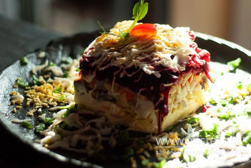 Традиційний салат з оселедця, картоплі, буряка, моркви та майонезу. Ситна та кольорова страва, де м'який смак оселедця гармонійно поєднується з овочами.