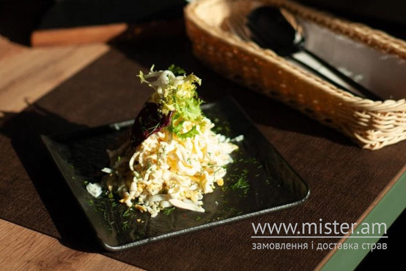 Смачний салат з тертим сиром , вареним яйцем та часником, заправлений майонезом.