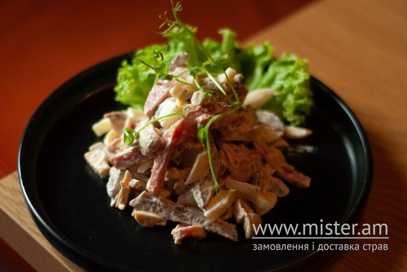 Ніжний язик, ароматна салямі, смачні гриби, м’які яйця, пікантна цибуля і ніжний майонез — все це чудово поєднується в одному смачному салаті.