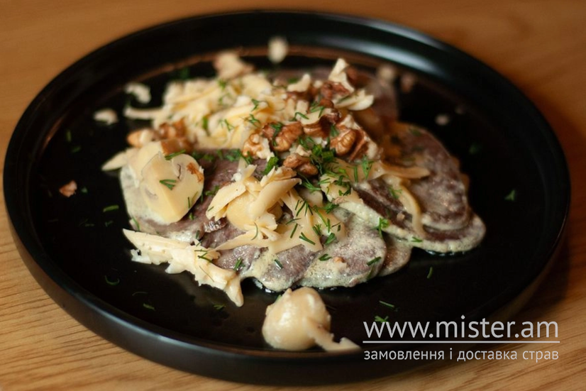 Смачний салат з вареного язика, грибів, сиру та грецьких горіхів, тушкованих у сметанково-гірчичному соусі.