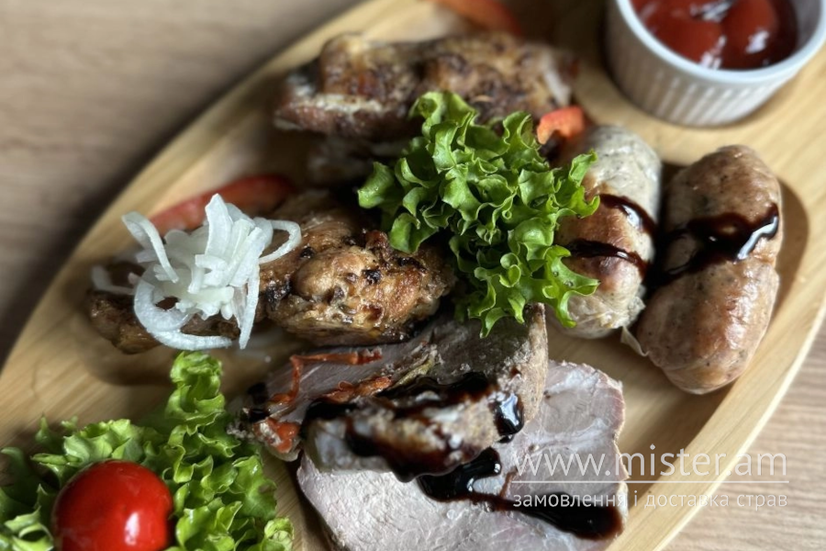 Апетитне поєднання різноманітних м'ясних делікатесів: ароматних ковбасок, соковитих запечених ребер та м'яса по-королівськи.