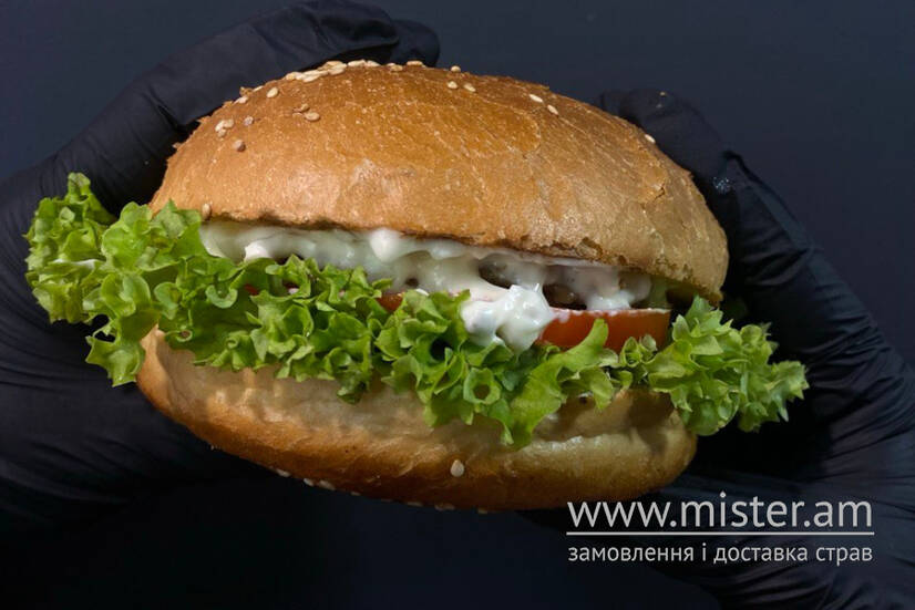 Куряча котлета, сир, салата, маринований огірок, соус.