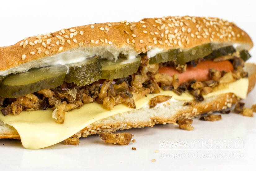 2 х сосиска, сир, маринований огірок, цибуля хрустка, соуси.