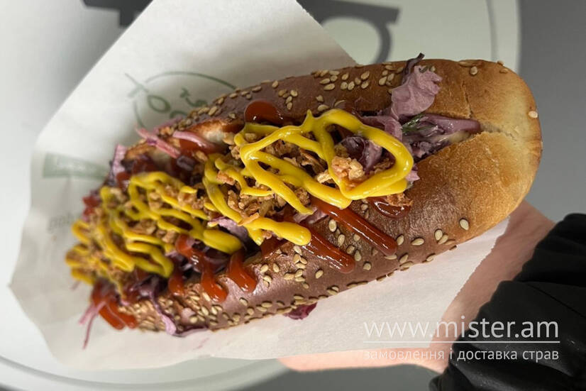Булка, 2 х сосиска, салат коул-слоу, цибуля кріспі, соус біг-дог, кетчуп, американська гірчиця.