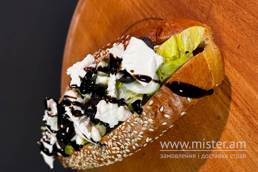 Булка, баварська сосиска, салат айсберг, фета, оливки чорні, часниковий соус, бальзамічний соус.