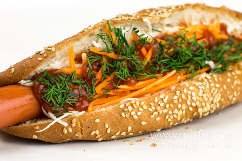 2 х сосиска, капуста, морква, зелень, соуси.