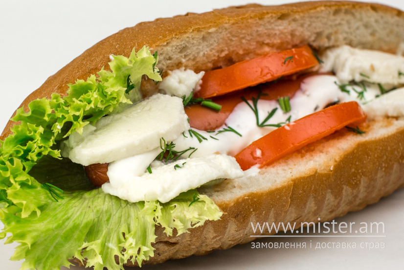Сосиска, моцарелла, помідор, часниковий соус, салата.