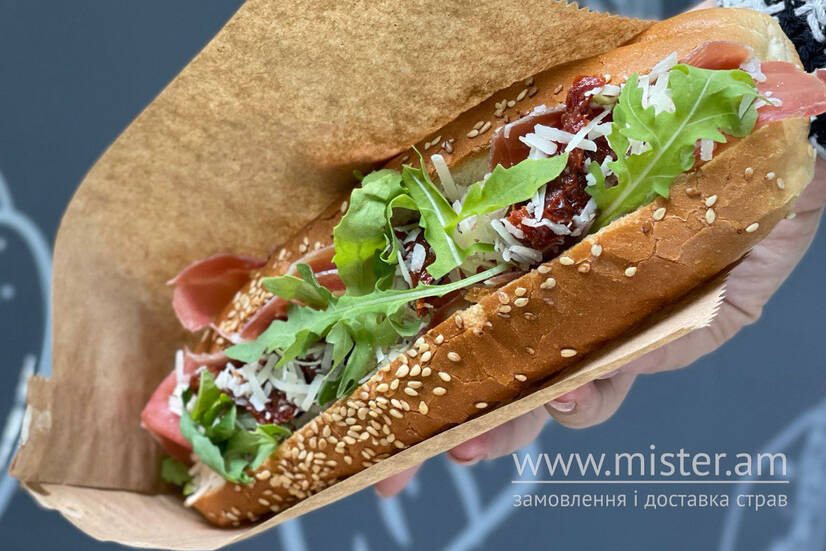 Булка, баварська сосиска, айсберг, вялені томати, пармезан, соус вершковий, рукола.