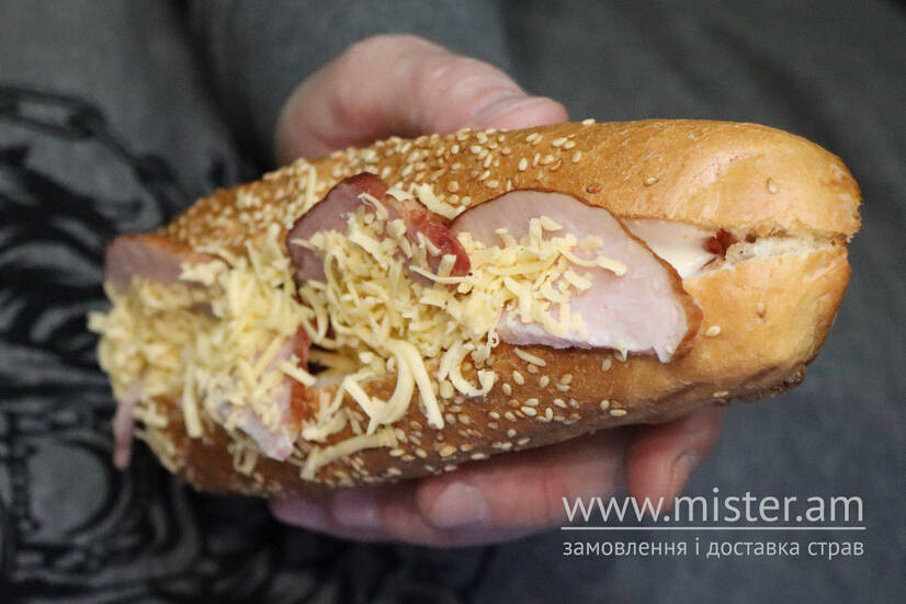 Булка, молочна сосиска, шинка, салата, соус біг-дог, BBQ.
