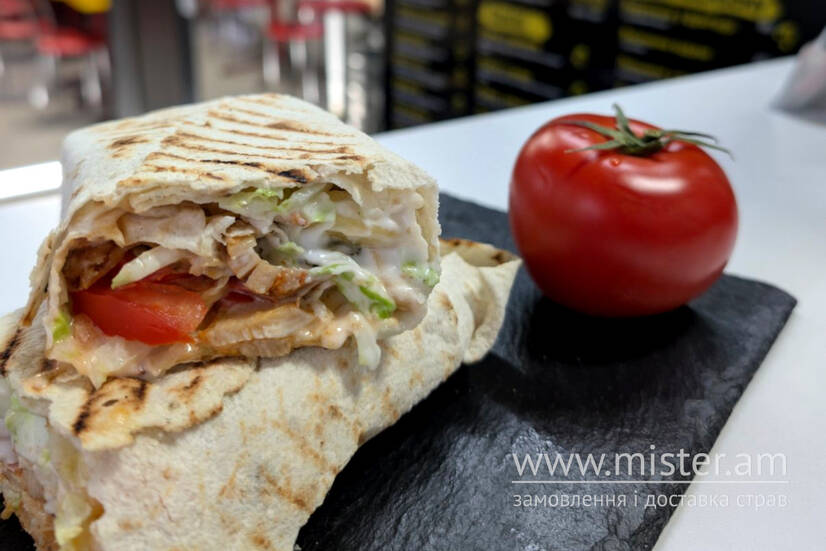 Куряче м’ясо, салат, огірок, помідор, фірмовий соус.