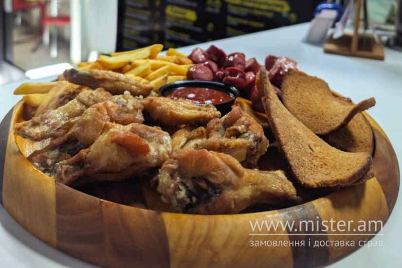 Картопля фрі, мисливські ковбаски, баварська сосиска, крильця, сухарики, соус.