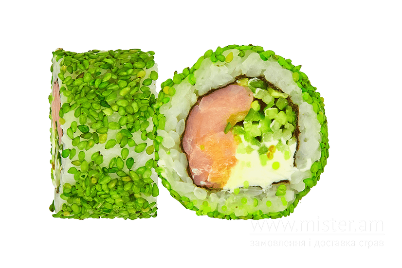 Рис, норі, крем-сир, огірок, копчений лосось, кунжут-васабі.