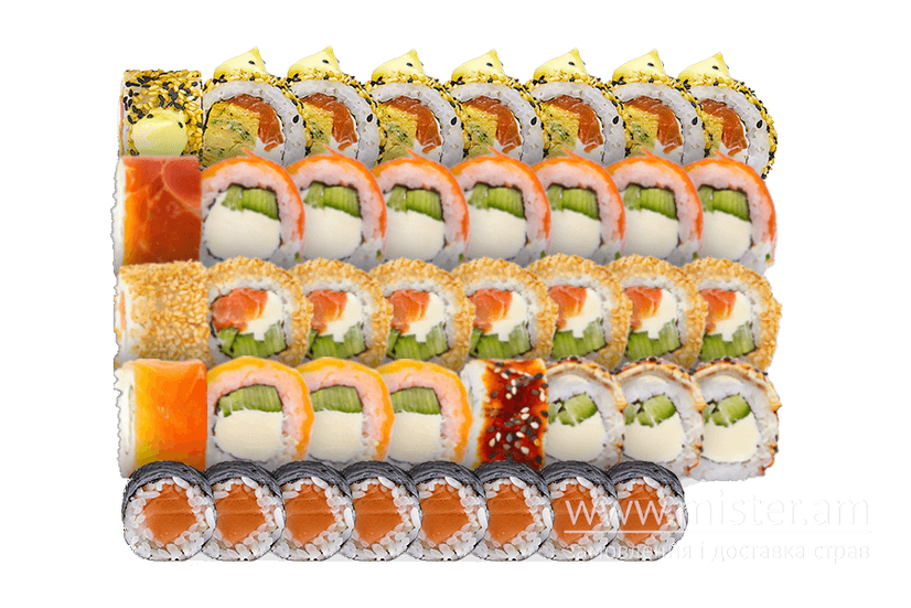 Рол токіо, рол італія, вайт лосось, філадельфія лосось 0.5, філадельфія вугор 0.5, макі лосось.