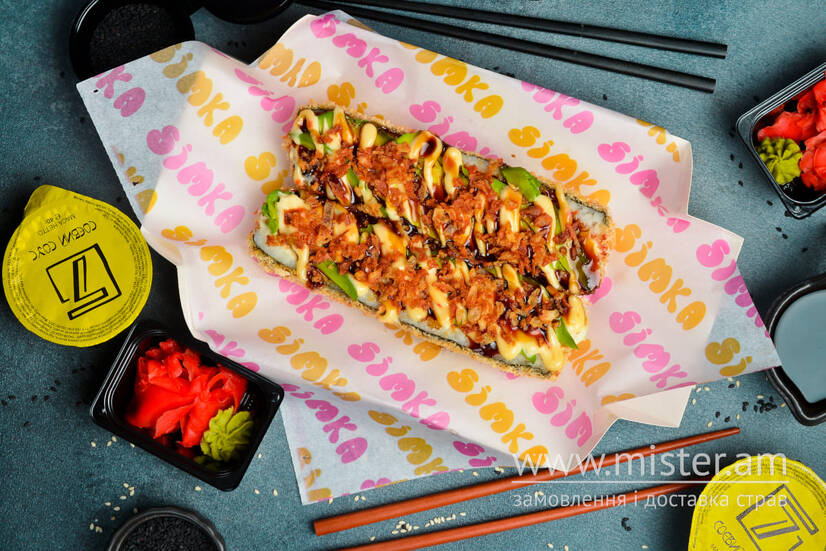 відкритий рол з лососем гриль, обсмажений у клярі та сухарях тепмура, авокадо, соус папрік, унагі, цибуля кранч