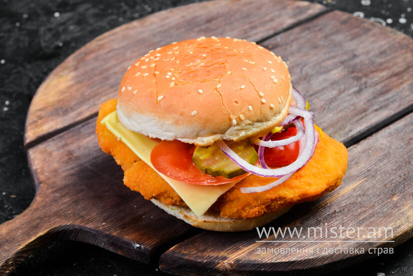 з курячим шніцелем огірки мариновані помідори цибуля сир і сирний соус