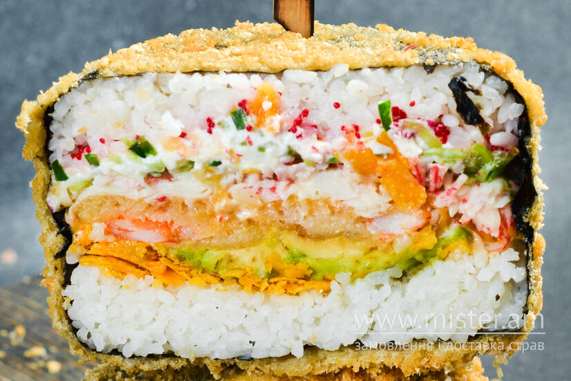 рис, тигрові креветки, сніжний краб, авокадо , чіпси начос, ікра Тобіко, крем-сиром, огірок та соусом папрік у хрусткій паніровці
