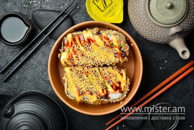 рис з креветками, чукою, ікрою Тобіко авокадо, сніжним крабом, огірком та чіпсами начос із соусом унагі і папрік та повітряними рисовими кульками у хрусткій паніровці