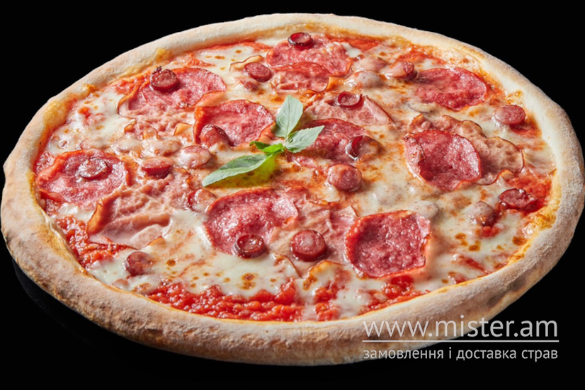 Соус томатний, моцарела, салямі, шинка, баварські ковбаски.