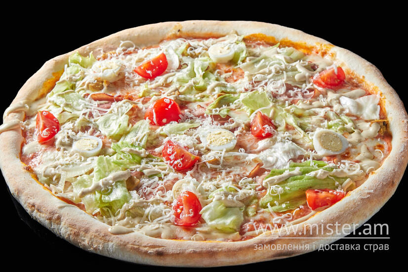 Соус томатно-вершковий, соус цезар, помідори чері,яйце перепелине, хрусткий салат, пармезан, шинка, куряче мясо, моцарела.
