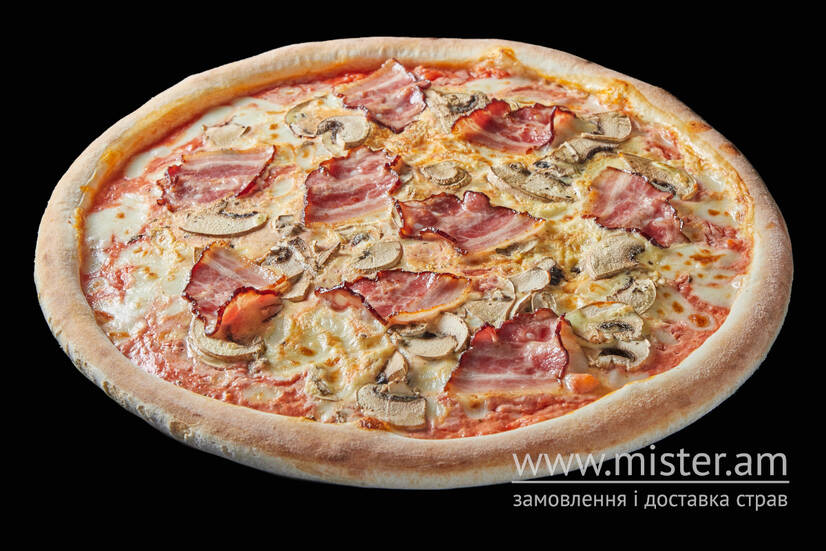 Соус томатно-вершковий, бекон, моцарела, печериці, запечене яйце.