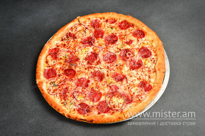 Соус вершковий, соус шрірача, салямі, сир лазур, червона цибуля, пластівці чилі.