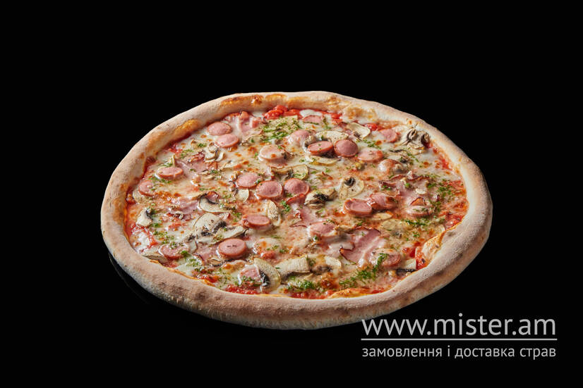 Томатний соус, моцарела, бекон, сосиски, печериці.