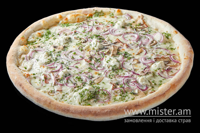 Соус вершковий, моцарела, бекон, печериці, кримська цибуля, сир фета, кріп.