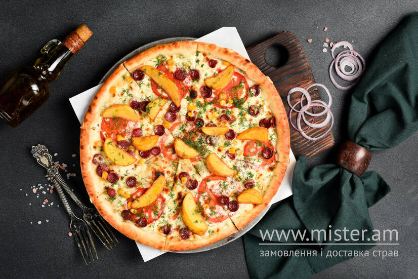 Соус вершковий, баварські ковбаски, моцарела, кукурудза, томати, картопляні скибки, кріп.