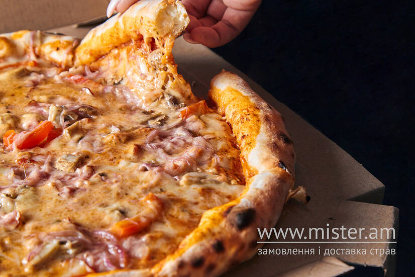 Сирні бортики, томатно-вершковий соус, моцарела, печериці, шинка, цибуля червона, перець болгарський, пармезан.