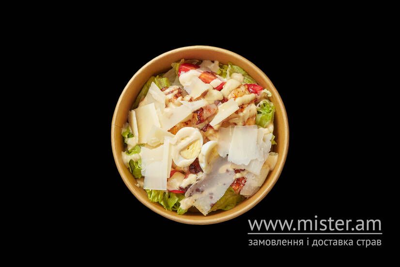 салат з куркою, чері, беконом, перепелині яйцями, сухариками пармезаном і соусом Цезар