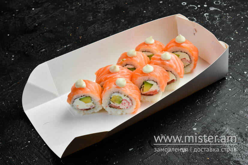 з лососем, авокадо, томатами, крабом та крем-сиром та японским майонезом