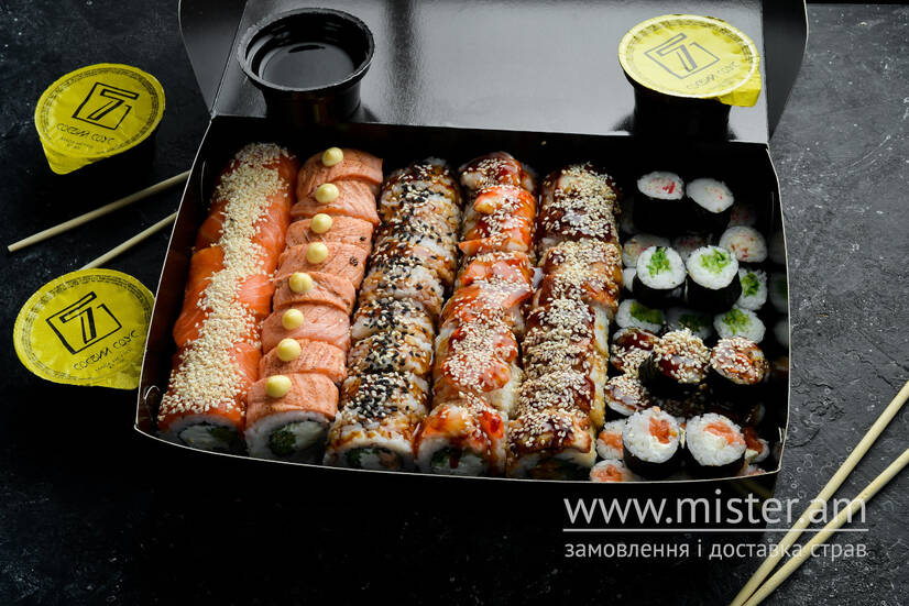 Філадельфія з лососем, філадельфія з вугрем, філадельфія з креветкою, філадельфія гриль лосем, сімка рол, філа з запеченим лососем, макі з крем-крабом, макі огірок, макі чіз лосось, макі з печеним лососем та унагі.