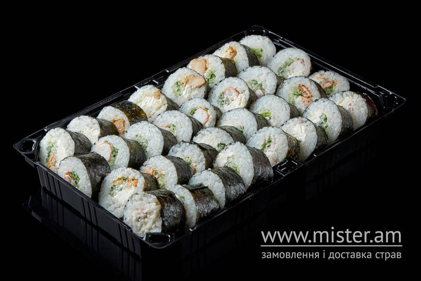 Футомакі з сурімі, футомакі з запеченим лососем, футомакі з креветкою, футомакі з куркою.