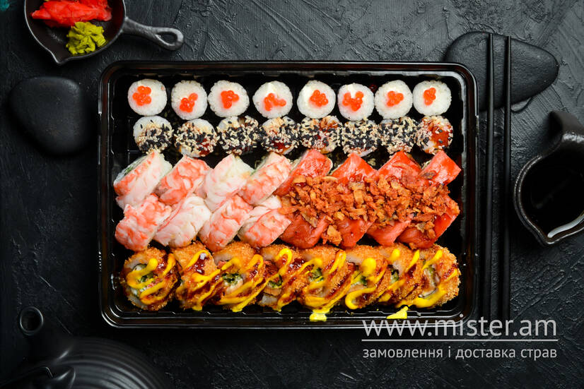 Кранч з лососем гриль та сирним соусом, філадельфія з креветкою, макі з вугрем, макі чіз з ікрою, філадельфія з цибулевими кранчами.