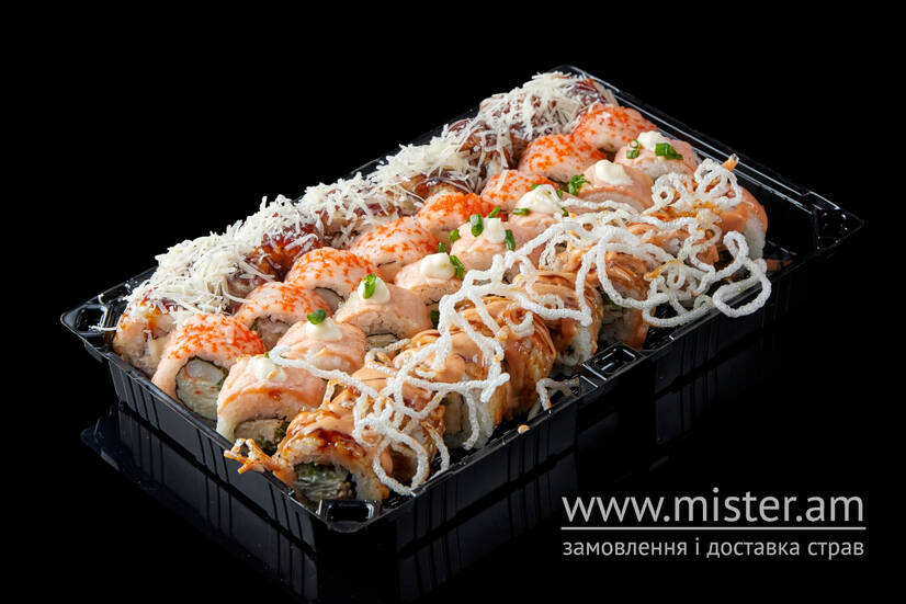 Премімум рол, кранчі з запеченим лососем, каліфорнія з креветкою, філадельфія гриль.
