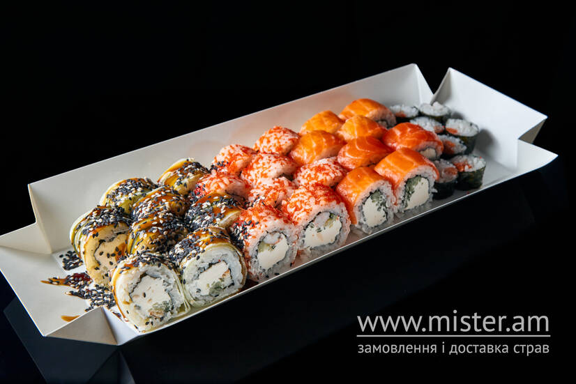 Каліфорнія з креветкою, філадельфія з лососем, зелений дракон, макі з лососем.