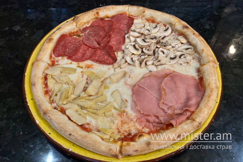 Соус неаполітано, моцарелла, артишок, салямі, шинка, печериці.