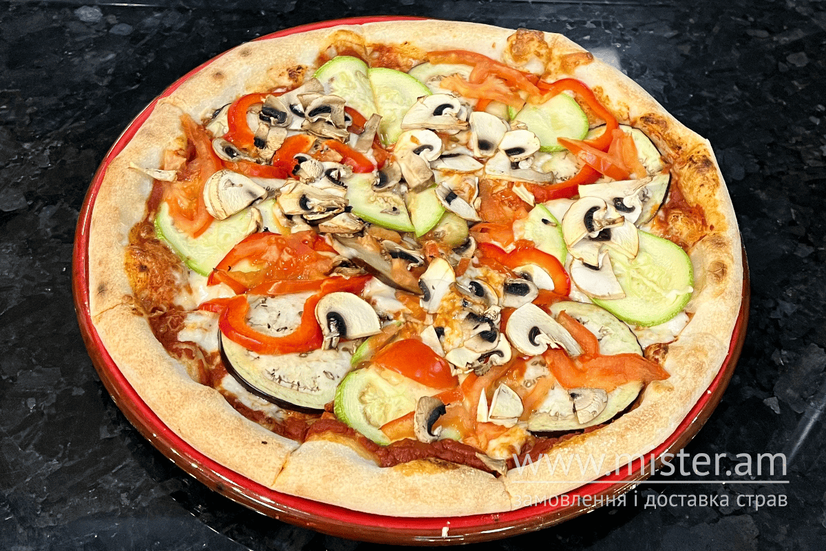 Соус неаполітано, моцарела, баклажан, печериці, помідор, перець болгарський, цукіні.