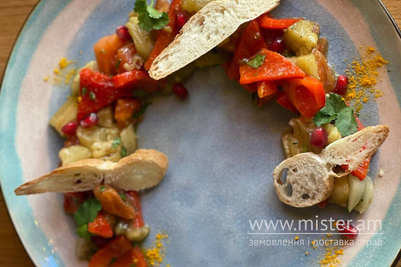 Перець, помідор, цибуля, баклажан, ароматна зелень.