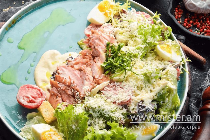 Свіжий салат, перепелині яйця, чері, хлібні сухарики, соус цезар, куряче стегно і багато пармезану