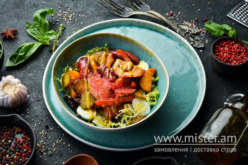 Смажена картопля, смажені мисливські ковбаски, мариновані хрумкі огірки, перепелині яйця, шматочки смаженого курячого філе, салат мікс, соус мед з гірчицею