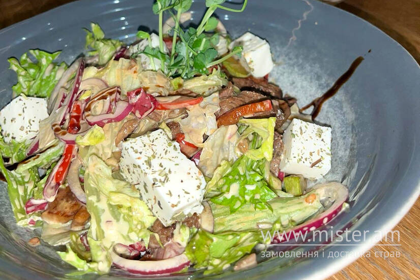 Мікс салату, вирізка яловичини, соус Теплий, печериці, цукіні, кедровий горіх, перець болгарський, фета, цибуля кримська, чері.