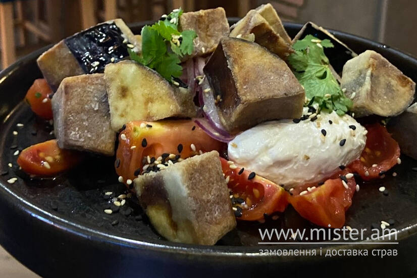 Баклажан, помідор, чері, кримська цибуля, мус з фети.