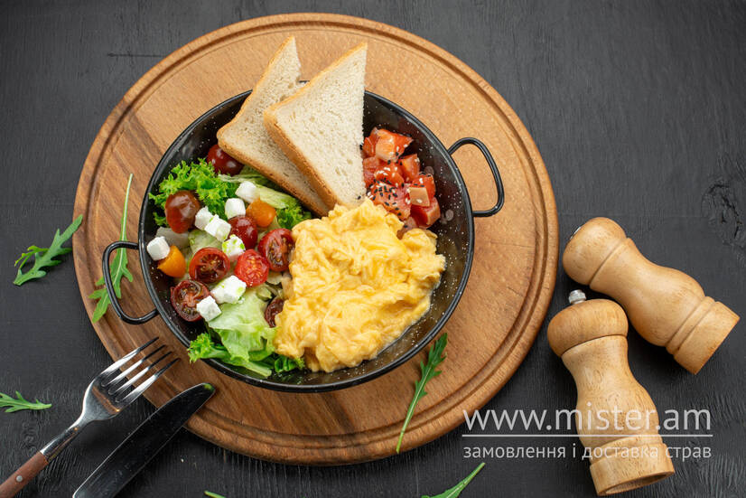Вершковий скрембл із слабосоленим лососем та салатним міксом з фетою.