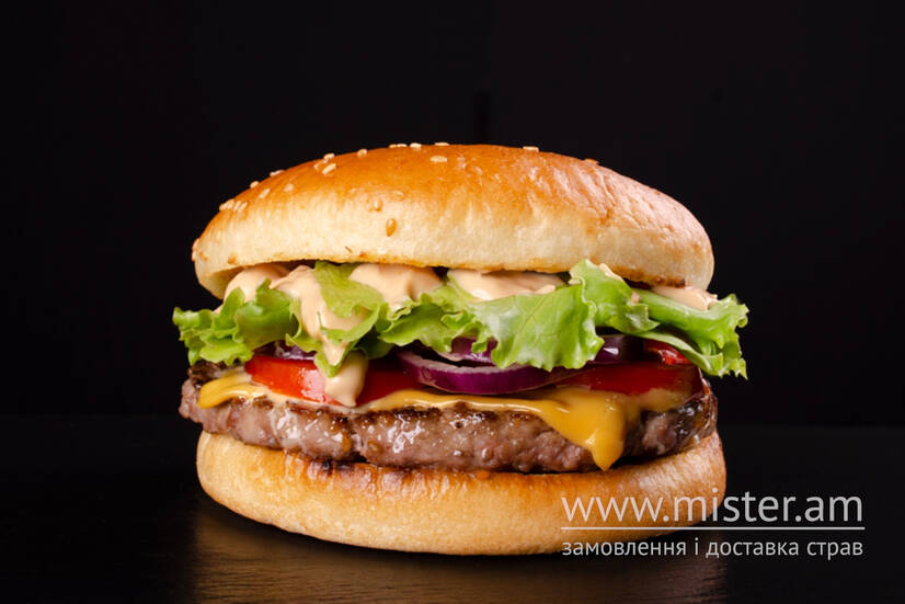 Соковита котлета з яловичини, листя салату, помідор, маринований огірок, бекон, сир чеддер, соус біг-мак та чипси начос.