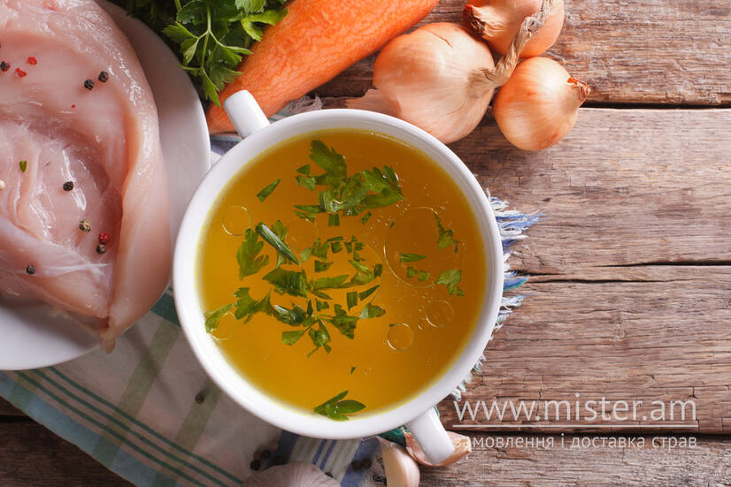 Наваристий курячий бульйон з шматочками ніжної курятини, локшиною,зеленню та запеченою грінкою з сиром.