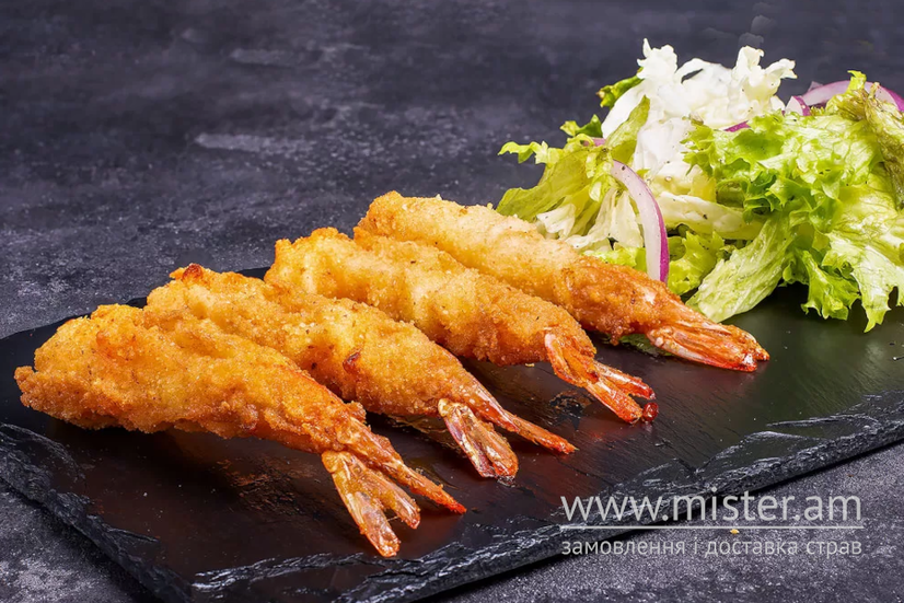 Хрустка та золотиста скоринка з ніжним м'ясом креветки, подається з соусом білий BBQ та чукою.