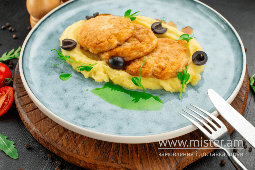 Соковиті та неймовірно ніжні котлети з окуня, у поєднанні з ніжним картопляним пюре та маслинами.